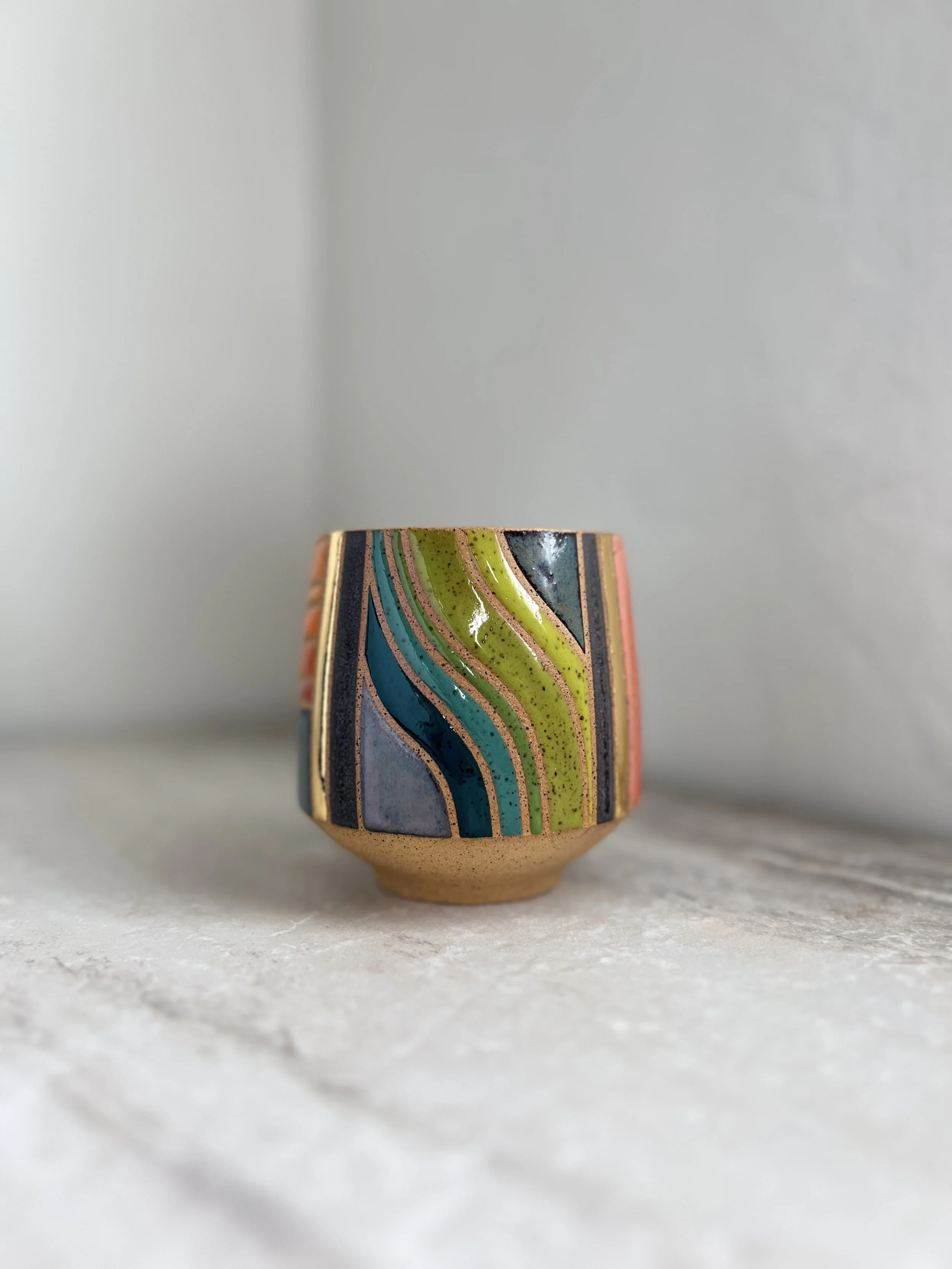 M18mug, stripes/arches (orange/greens/pinks) 22k gold